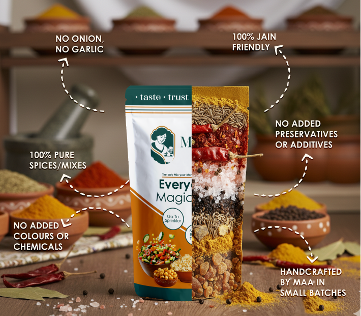 Your go-to enhancer for every dish. The Everyday Magic Mix by Mom’s Mixes is crafted from 100% pure, clean Jain spices to add the perfect balance of tangy, spicy, and flavour to any meal. Sprinkle it on sabzi, dal, parathas, snacks, or salads to instantly elevate taste, without any preservatives, MSG, onion, or garlic.