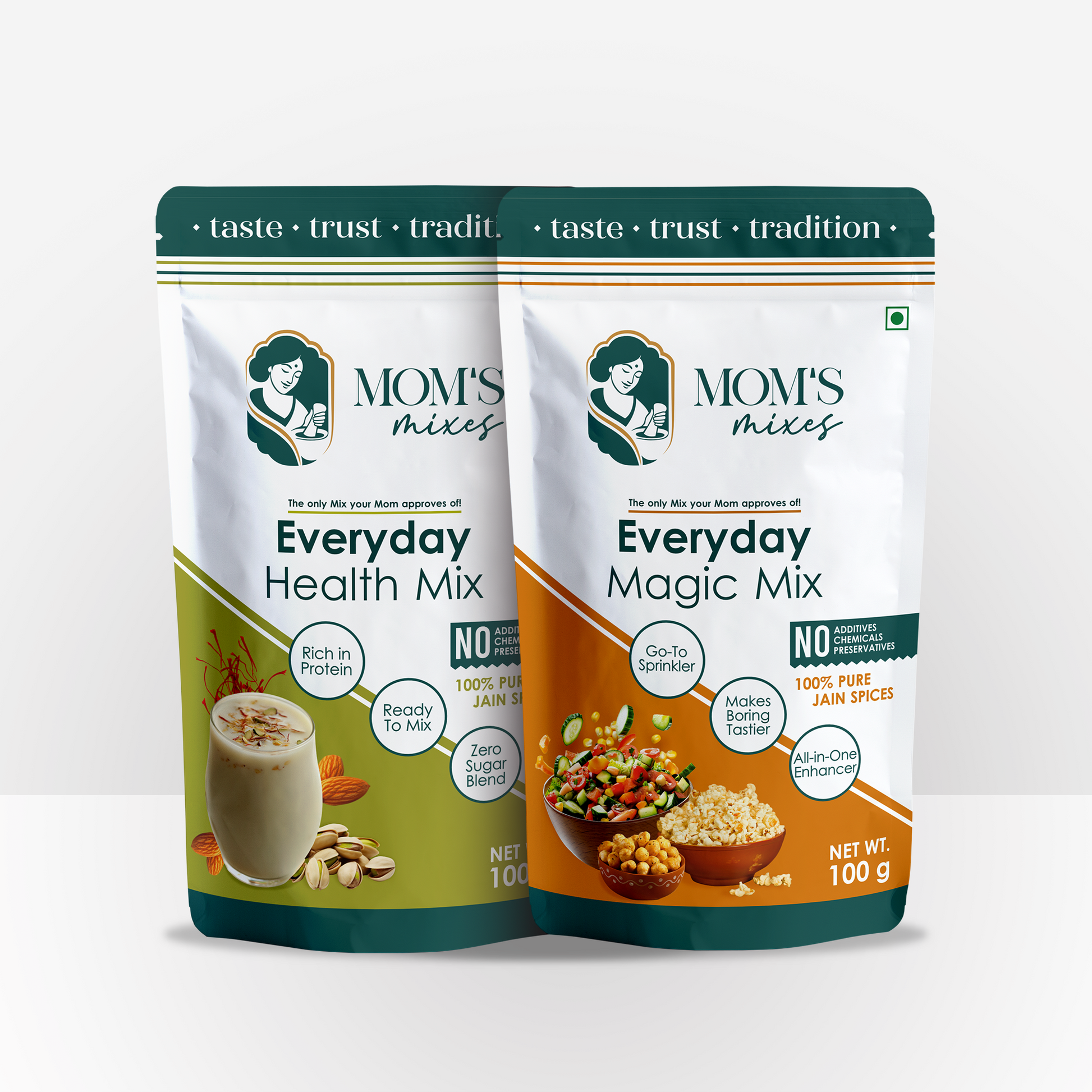 Bring health and taste together with the Mom’s Mixes Everyday Combo. This pack includes our Everyday Magic Mix, an all-in-one seasoning that makes every meal tastier, and our Everyday Health Mix, a protein-rich, no-sugar blend that turns milk into a nourishing delight. Crafted with pure, Jain-friendly ingredients, both blends are free from preservatives, fillers, and chemicals. Perfect for families who want delicious, wholesome meals without compromise.