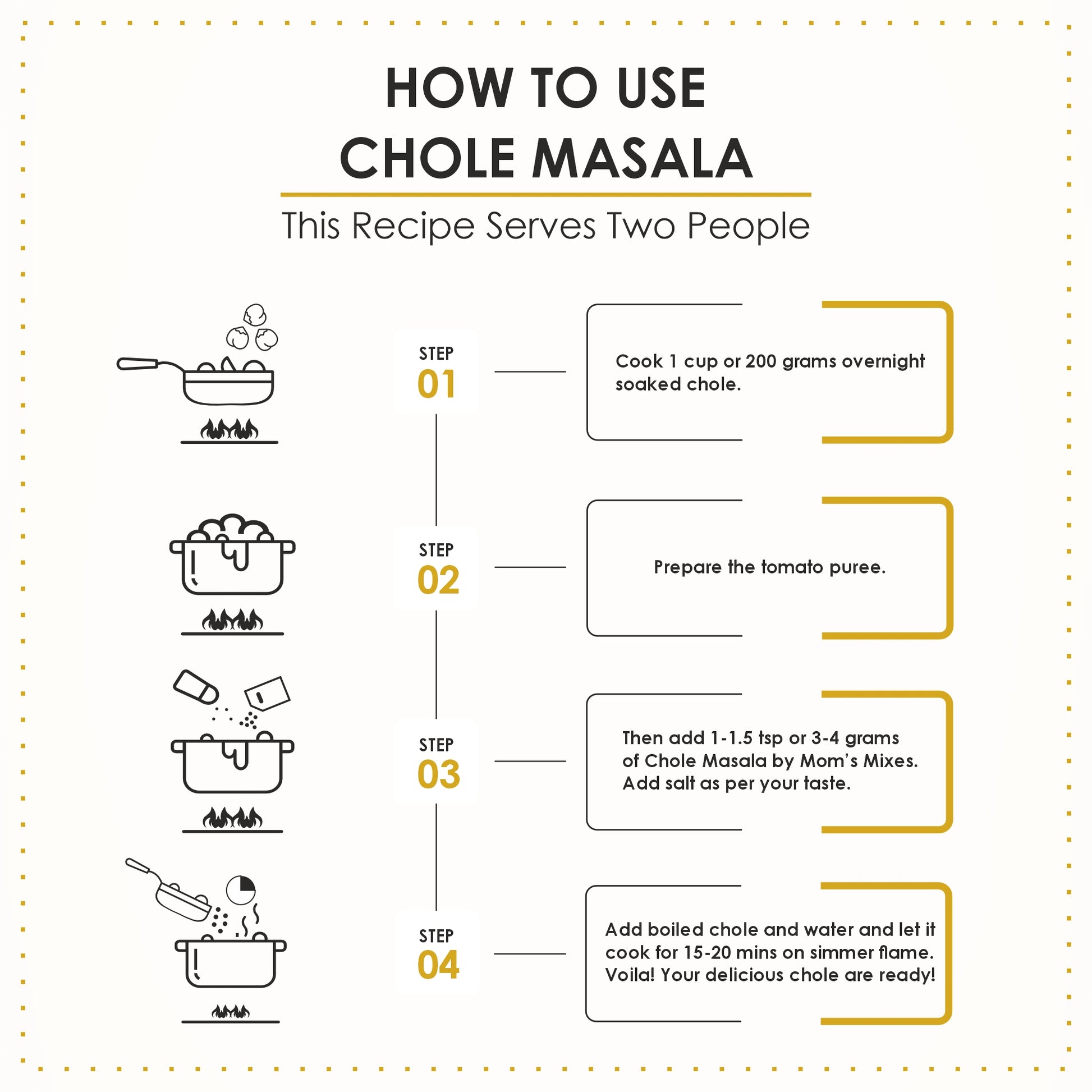 Chole: Add 1–2 tsp masala to boiled chole while cooking with onion-tomato masala.