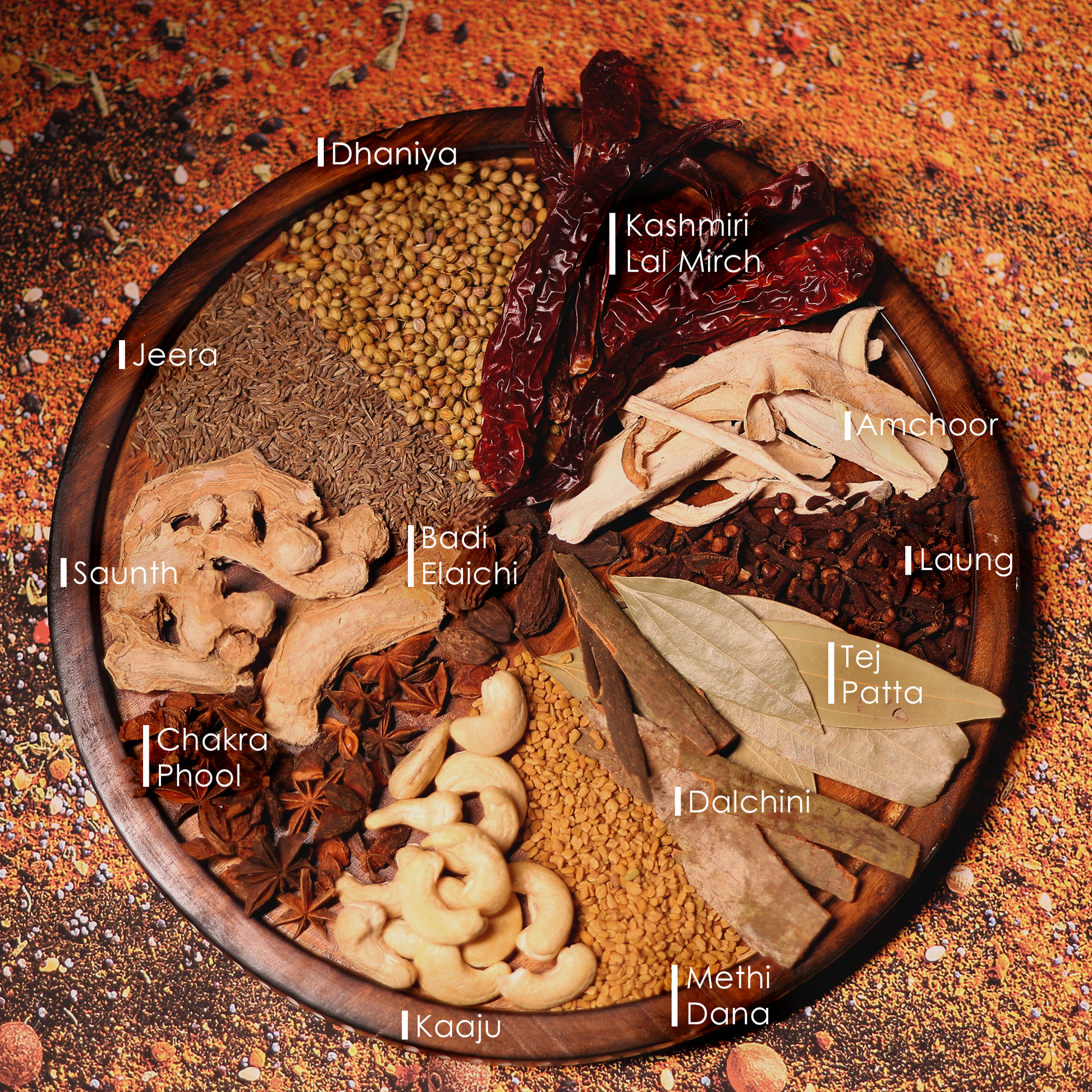 Rajma Masala: Dhaniya, Jeera, Kashmiri Lal Mirch, Kaali Mirch, Amchoor, Haldi, Methi Dana, Laung, Kaala Namak, Sendha Namak, Saunth, Anardana, Chakar Phool, Badi Elaichi, Tejpatta, Dalchini, Kasuri Methi, Citric Acid, Jaiphal